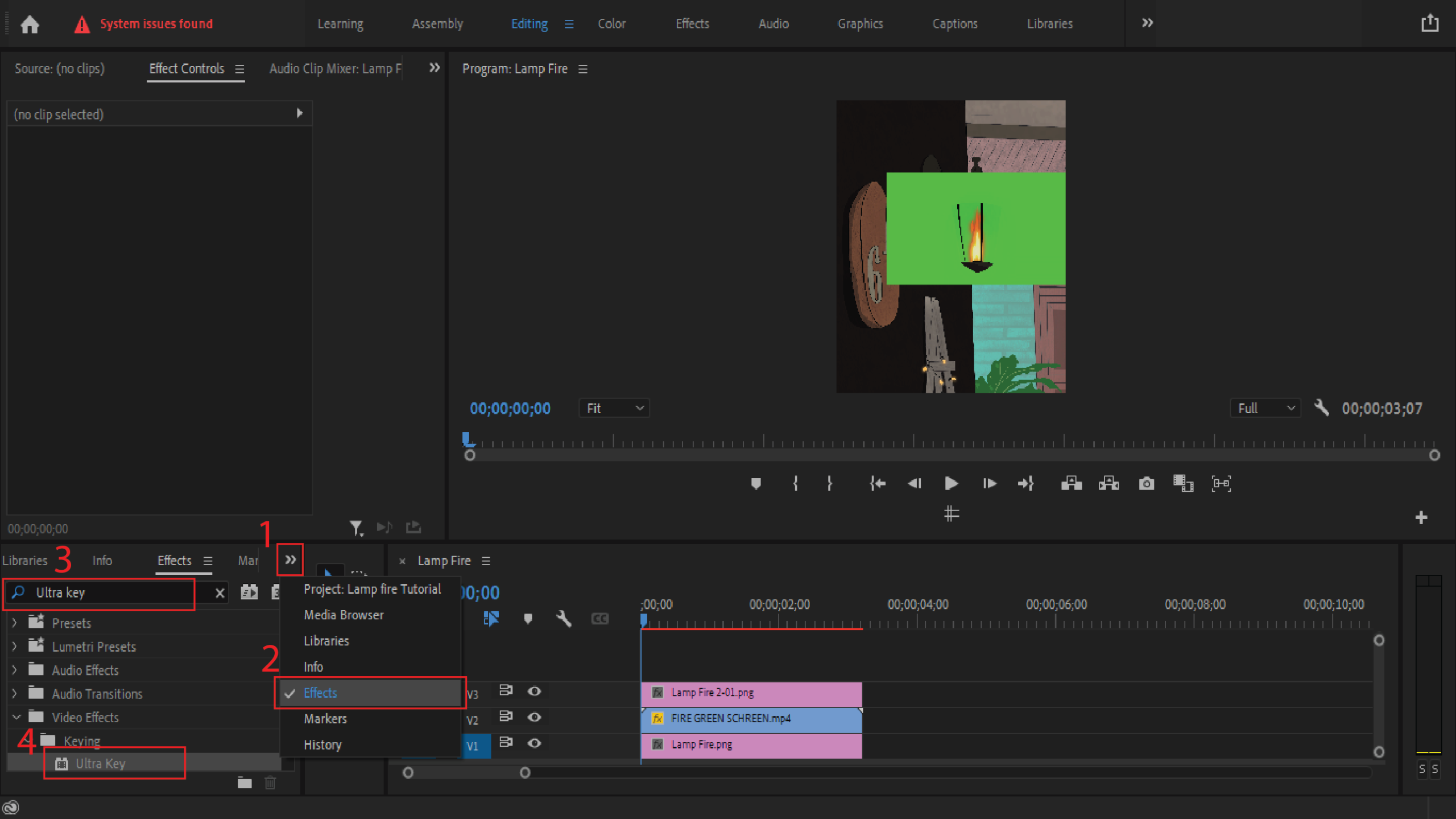 - Langkah pertama import bahan yang akan di hilangkan green screen nya, setelah itu – klik Panah [>>] – Pilih [Effec] – kemudian ketik di pencarian [Ultra Key] – scroll kebawah temukan [Ultra Key], perhatikan gambar dibawah :