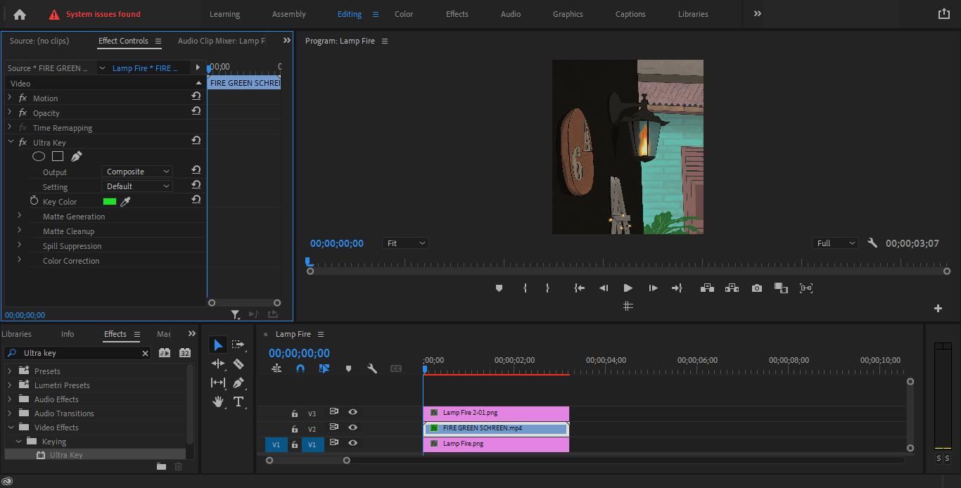 - Setelah Kamu menemukan [Ultra Key] – Drag kebagian Objek Green sreen yang ada di Timeline – sesudah di drag maka akan muncul di [Effec Control] bagian atas Ultra Key seperti gambar dibawah.